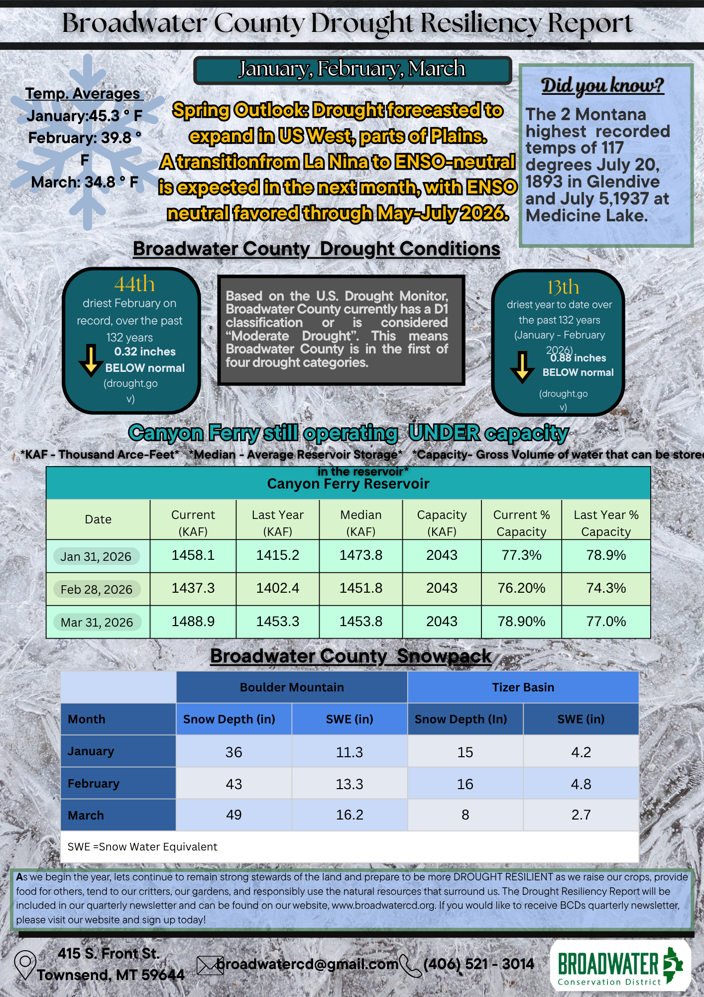 The Broadwater Drought Resiliency Report (BDRR) is a monthly report that describes the current water conditions within Broadwater County. This report serves as a tool to aid in our resilience to land use changes, weather, and climate conditions.